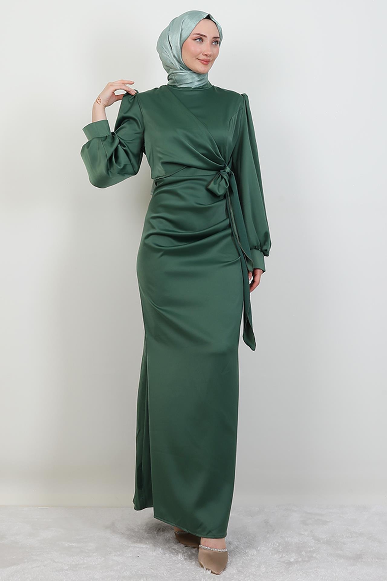 Saten Yan Kuşaklı Elbise Açık Yeşil (424552-AY)