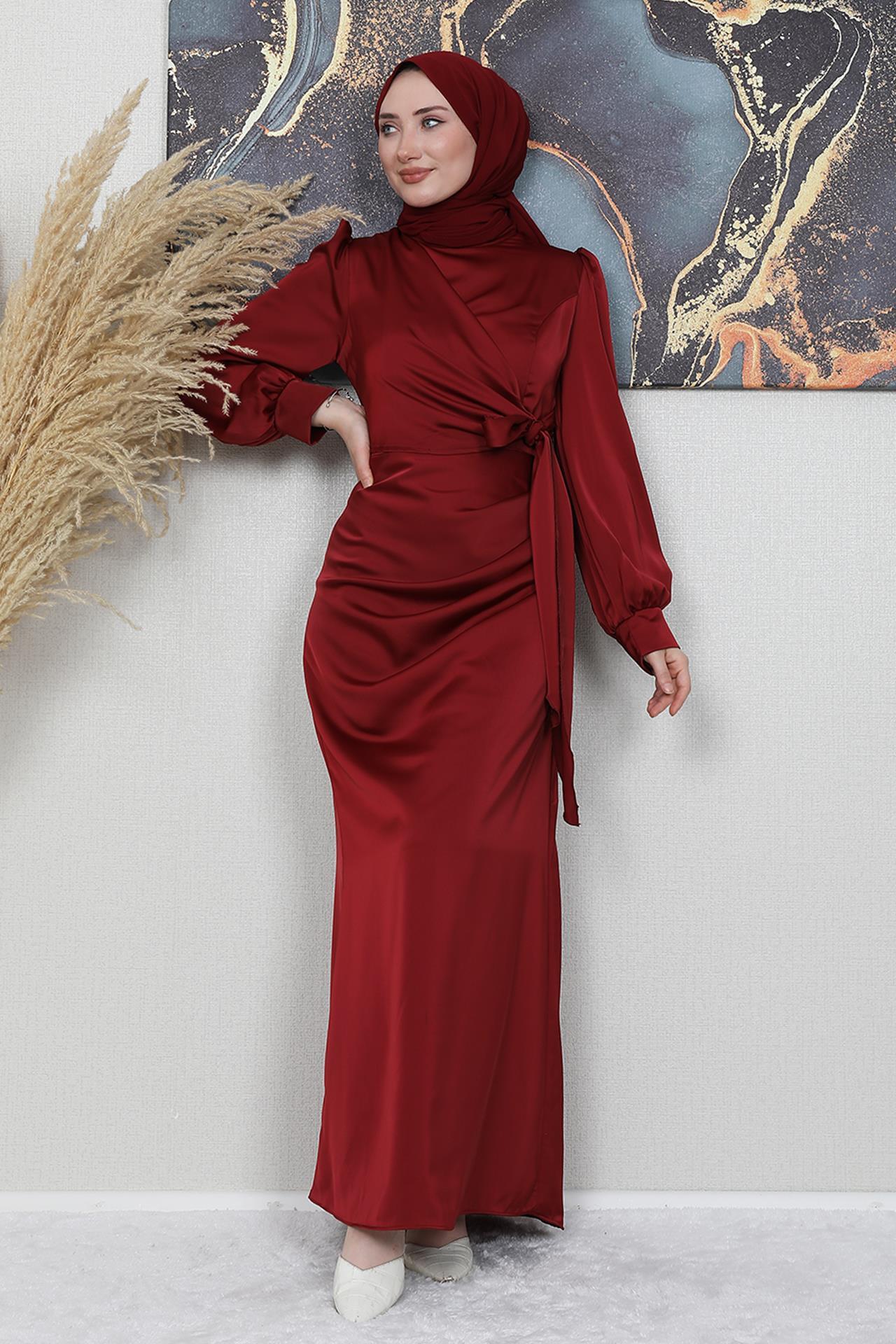 Saten Yan Kuşaklı Elbise Bordo (424552-B)
