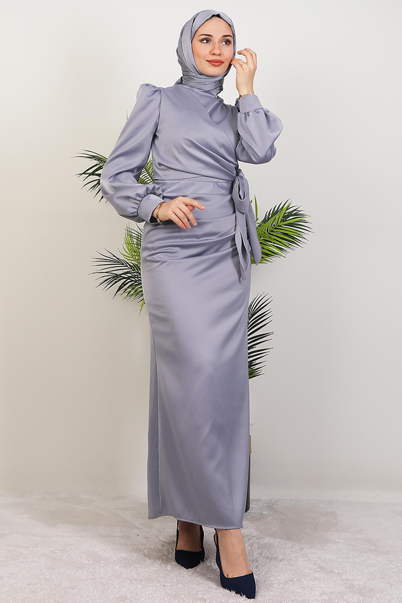 Saten Yan Kuşaklı Elbise Gri (424552-G)