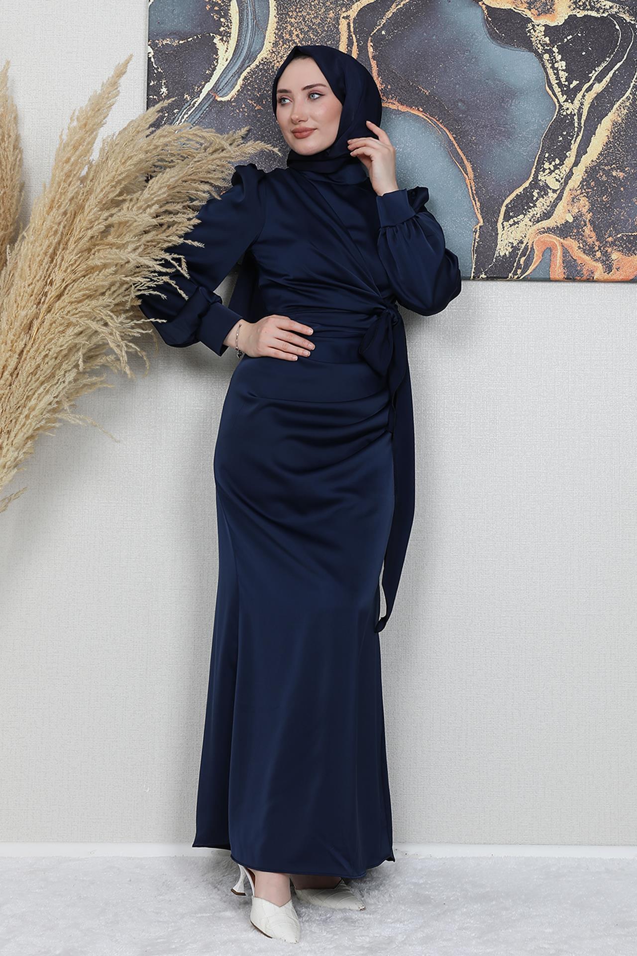 Saten Yan Kuşaklı Elbise Lacivert (424552-L)