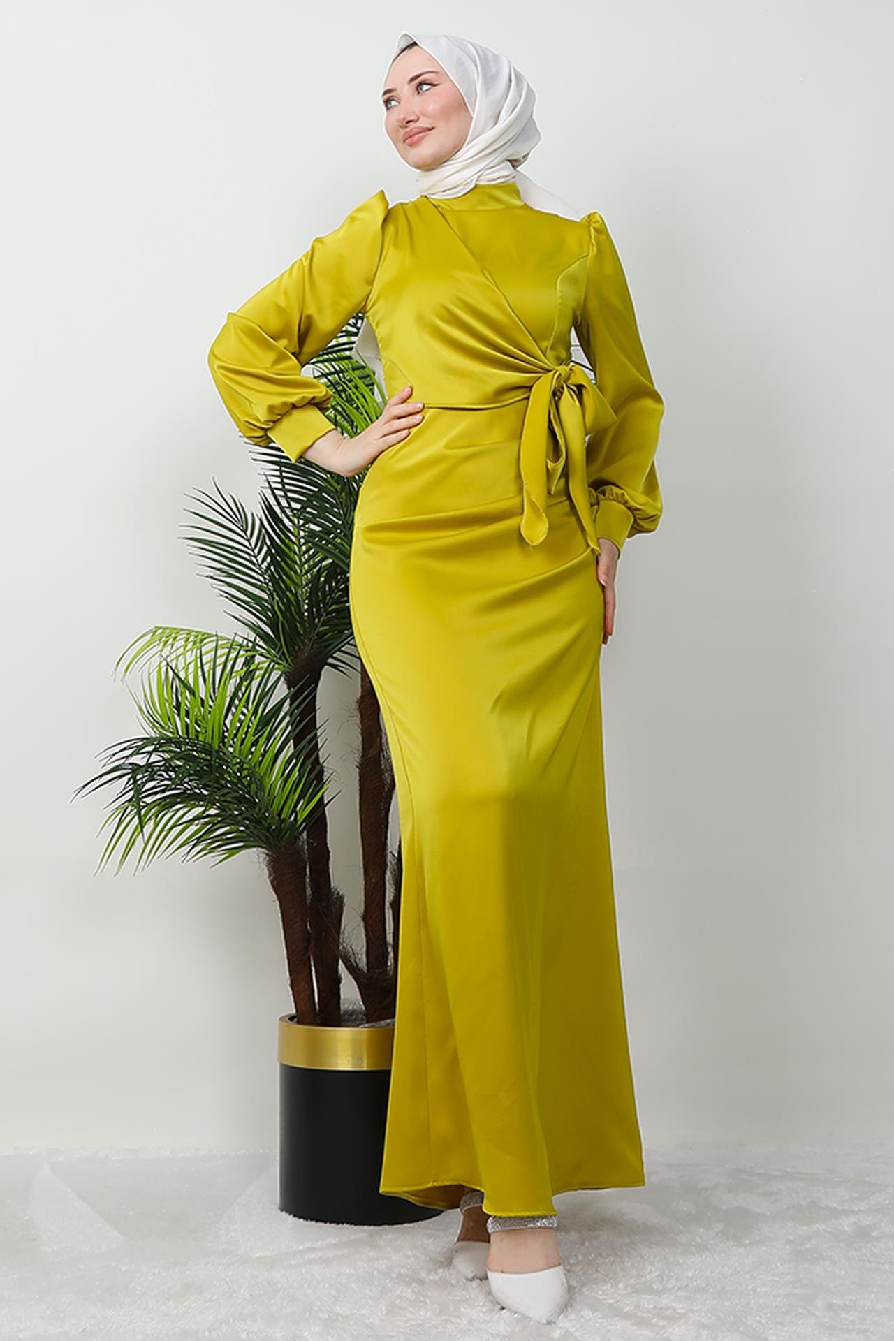 Saten Yan Kuşaklı Elbise Yağ Yeşil (424552-YY)