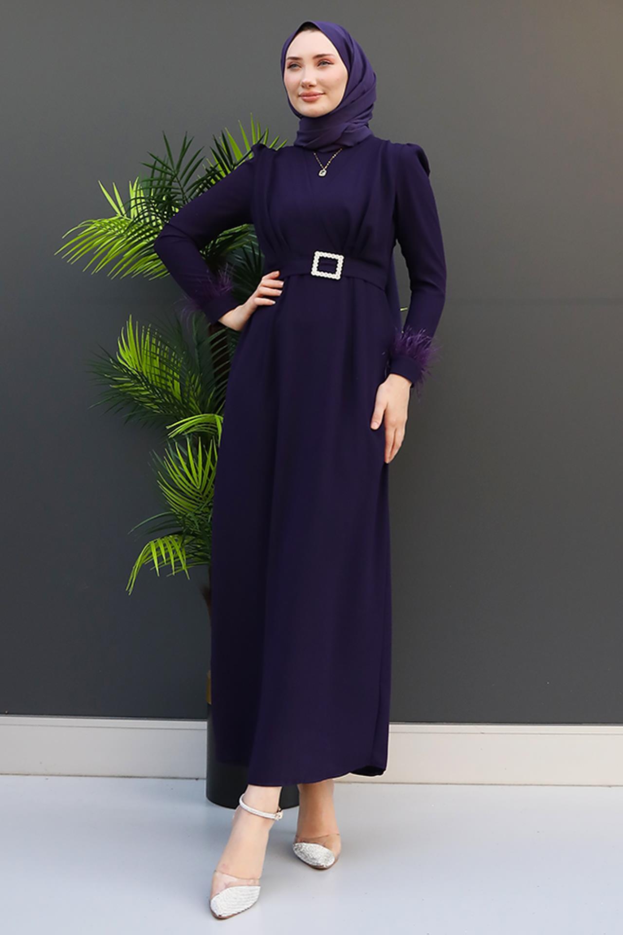 Tüy Detay Tesettür Elbise Koyu Mor (633008-KOM)