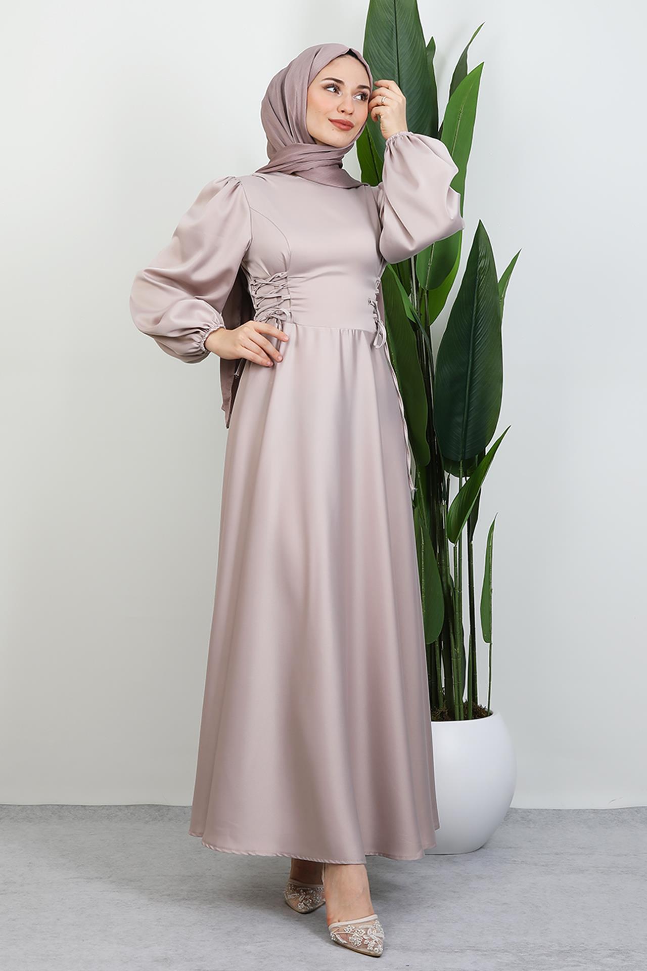 Yandan Bağcıklı Kloş Elbise Açık Gül Kurusu